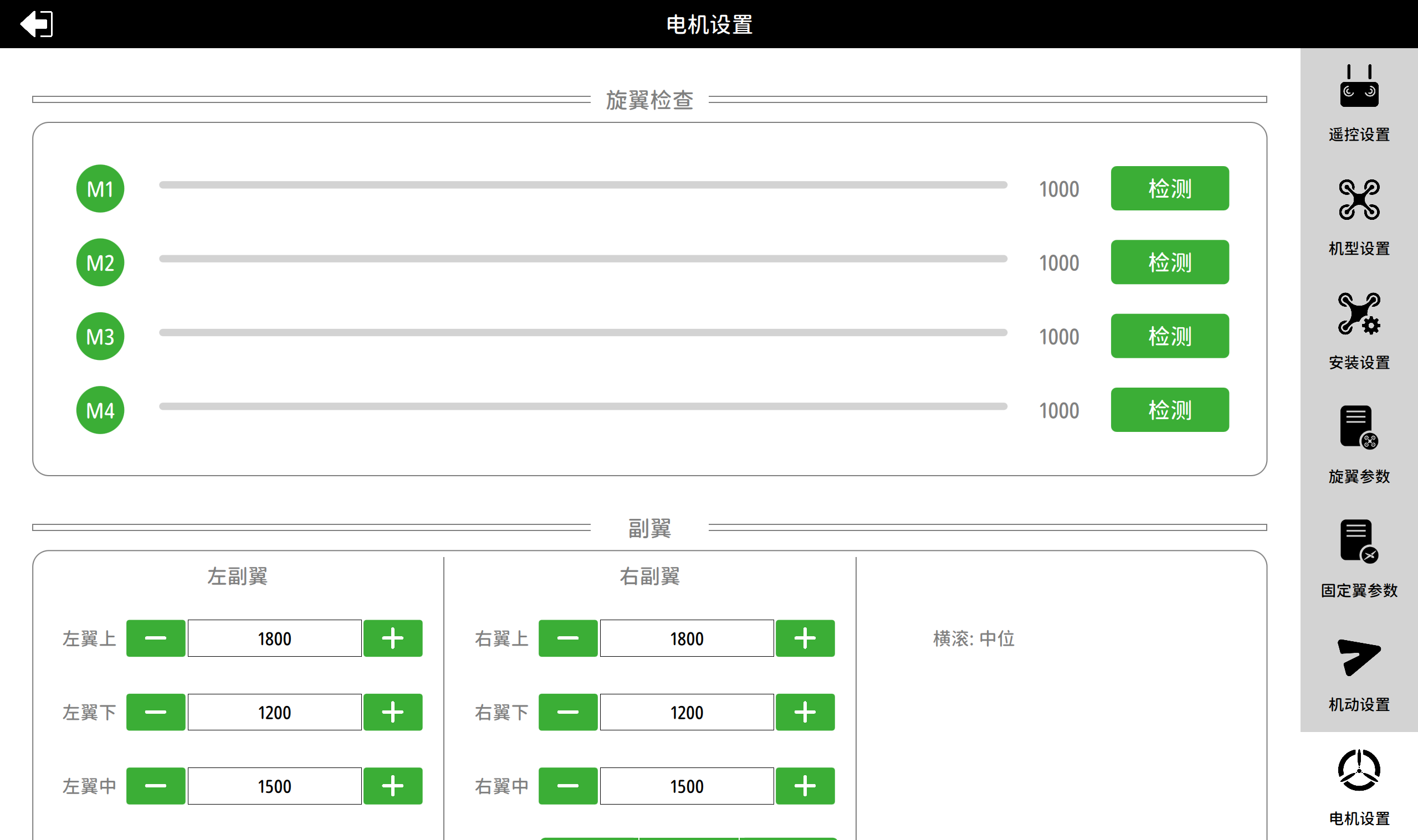 在此界面进行飞控模块、天线、遥控器、电调等的设置。